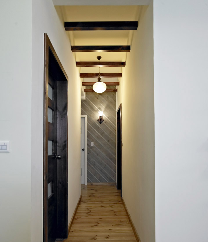 廊道天花以實木樑簡約造型呈現實木質調